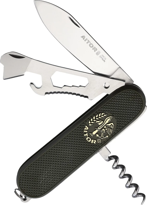 4″ (10.16cm) closed. Green ABS handle. Tools include: Large blade l Keyring l Bottle opener l Can opener l Hex/Bit driver l Corkscrew l Screwdriver tip. Boxed. Made in Spain.