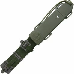 12.5″ (31.75cm) overall. 7″ (17.78cm) black coated sawback MoVa stainless blade. Camo hollow cast magnesium/aluminum handle with lashing hole and black cord lanyard. Included in the handle: fishing kit, sewing kit, scalpel, external applications, nippers, pencil, compass and magnesium pill. Black polyamide belt sheath. Boxed. Made in Spain.