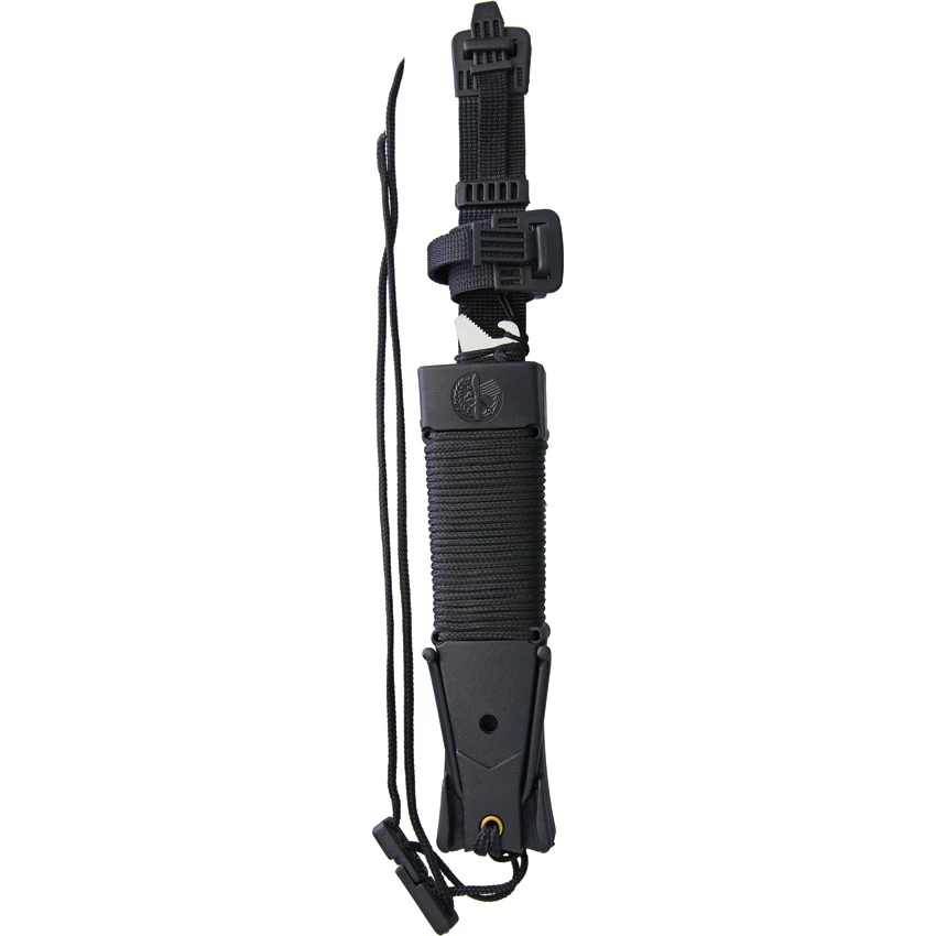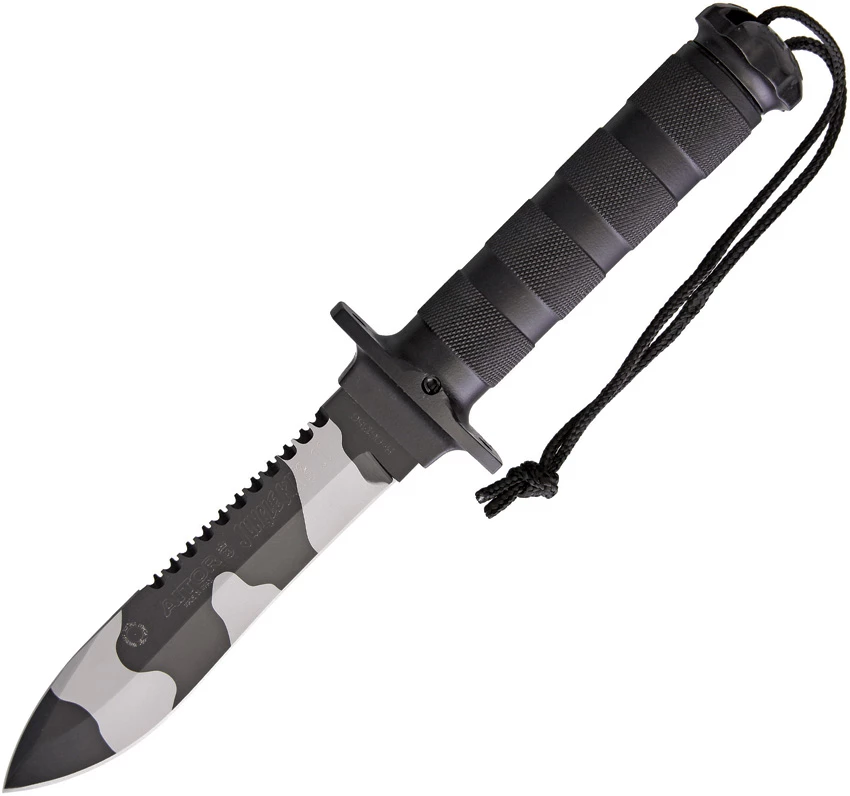 10.75″ overall. 5.38″ sawback stainless spear point blade. Black knurled stainless handle. Black and gray camo finish blade. Pommel unscrews to reveal a compass inside cap and small survival kit stored in clear acrylic tube in handle. O-ring sealed. Sheath also stores a 4.88″ overall skinner with 1.38″ guthook blade. One piece stainless construction with flathead screwdriver end, bottle/can opener, and nylon lanyard. Also stored inside sheath is a pullout tray with latex powerbands for slingshot. Back of tray features ruler, S.O.S. Signals and signaling mirror. Outside of sheath features several feet of nylon cord, black coated stainless metal arms at tip of sheath that flip out to serve as slingshot, and a sharpening stone on the back. Boxed. Made in Spain.