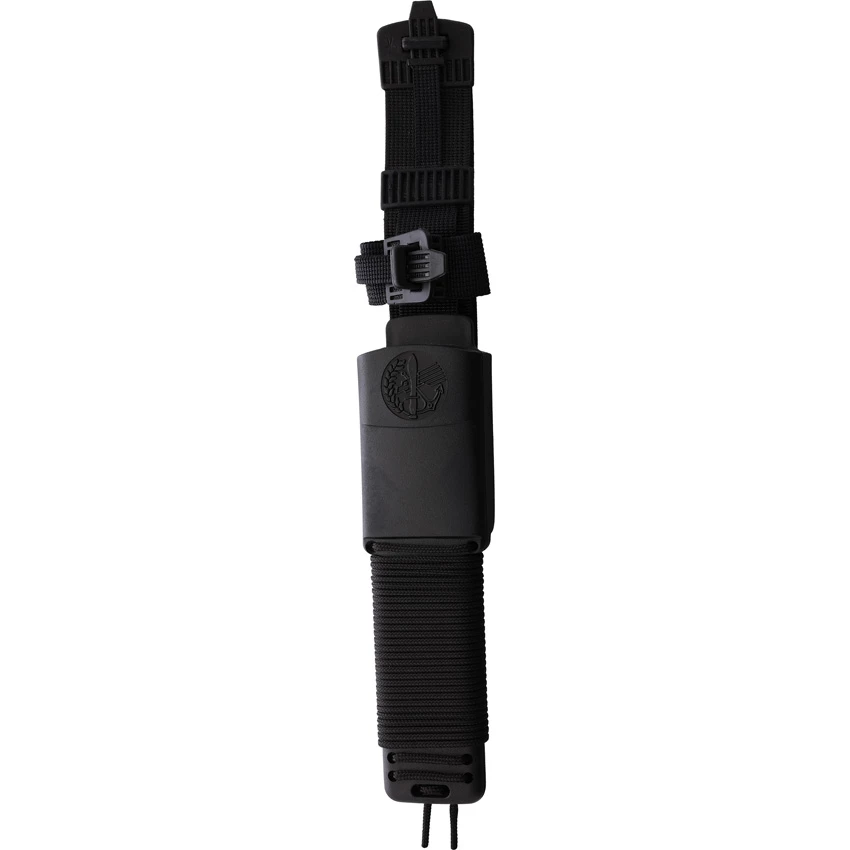 12.25″ (31.12cm) overall. 7″ (17.78cm) black finish sawback stainless blade. Black checkered aluminum handle. Lanyard hole. Hollow handle contains survival kit with fishing kit, sewing kit, scalpel, compass, tweezers, and dressings. Black polymer belt sheath. Boxed. Made in Spain.