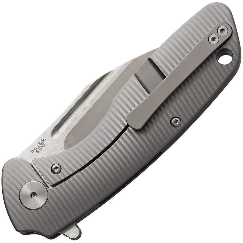 4.5″ closed. 3″ satin finish S35VN stainless blade. Gray anodized titanium handle. Extended tang. Lanyard hole. Pocket clip. Metal tin. Black nylon zippered storage case. Boxed. Made in China.