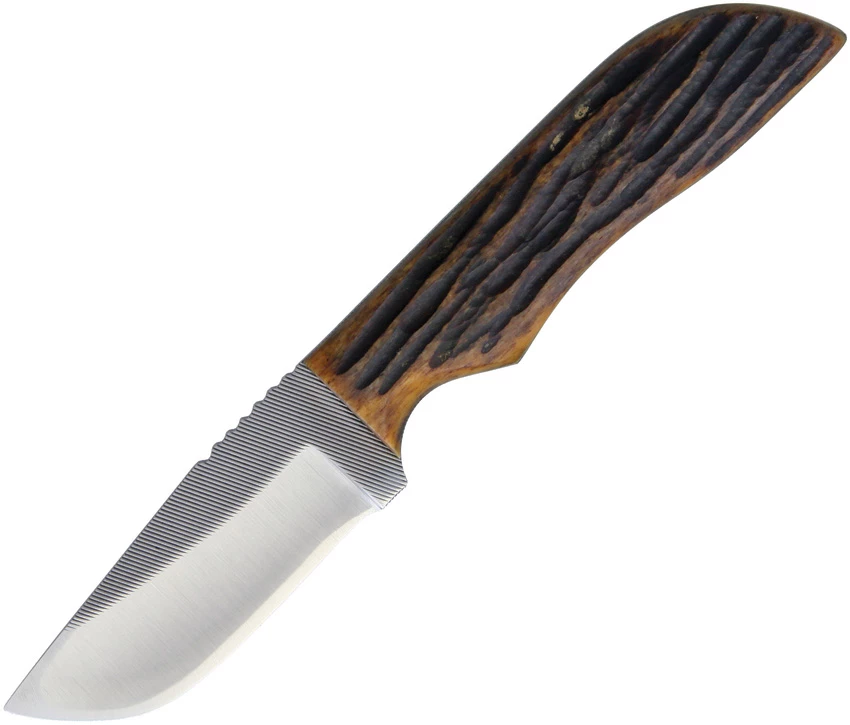 7.5″ overall. 3.13″ blade. Amber bone handle. Full tang. Brown leather belt sheath. Bulk packed. Made in the USA.