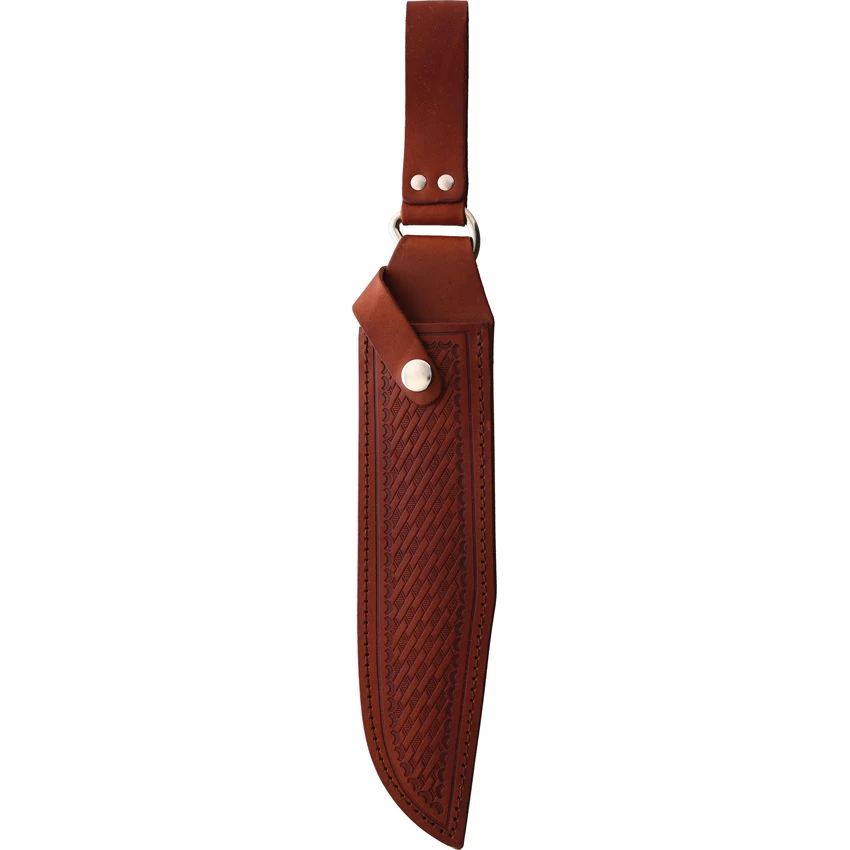 15″ (38.1cm) overall. 8″ (20.32cm) satin finish D2 tool steel bowie blade. India stag bone handle. Brass guard and pommel. Full tang. Lanyard hole. Brown leather belt sheath. Boxed. Made in USA.