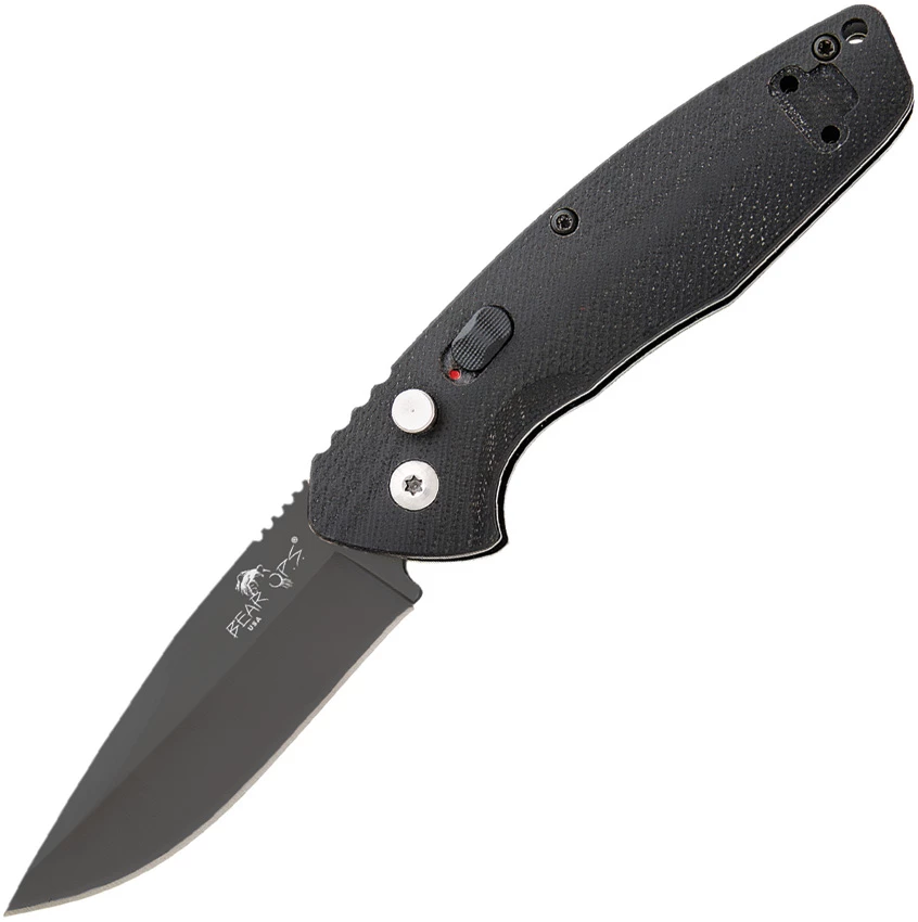 Automatic opening. 4.13″ (10.49cm) closed. 3″ (7.62cm) black finish 14C28N Sandvik stainless blade. Black G10 handle. Lanyard hole. Pocket clip. Safety mechanism. Boxed. Made in USA.